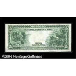Fr. 871c $5 1914 Federal Reserve Note Very Choice Cris <B>Fr. 871c $5 1914 Federal Reserve Note Very Choice Crisp New.</B></I> A very challenging number, with somewhat over 30 in the census. The example we offer this evening has pack fresh paper surfaces and would without qualifications be entitled to an enthronement as a Gem, but for the somewhat narrow upper margin. Still, its great overall eye appeal may carry its price to near the Gem level. <BR><BR><B>Important notice:</B> Heritage usually auctions material at the rate of 200-250 lots per hour. On some occasions eBay Live bid software or the Internet may not be able to keep up with the pace of the auction. We recommend placing a realistic absentee bid now as insurance to avoid disappointment. Occasionally the auctioneer may eliminate or reject an eBay Live bid, and the auctioneer may also reopen a lot after the close of the eBay live bidding (usually because we missed an audience bid), and may reject your bid even if it shows you as the winning bidder. By bidding via eBay Live, you agree that Heritage may award the lot to another bidder at its sole discretion under the circumstances described above or any other reasonable circumstances. Since eBay bids are not shown to us until we open the lot on the floor, we treat those bids just like floor bids. In most cases the floor responds before the eBay bid is presented to us, due to Internet lag time, so for consistency we have made it a policy that floor bids are always considered first over tie eBay live bids. Also please note that all Heritage lots purchased through eBay Live carry a 20% Buyer's Premium. Please make sure you read the Terms and Conditions before you bid. This lot is being auctioned in conjunction with a live floor auction by Heritage Galleries & Auctioneers. All final auction and invoice information will be supplied by Heritage Galleries & Auctioneers, and all other information should be considered preliminary. Lot:17696