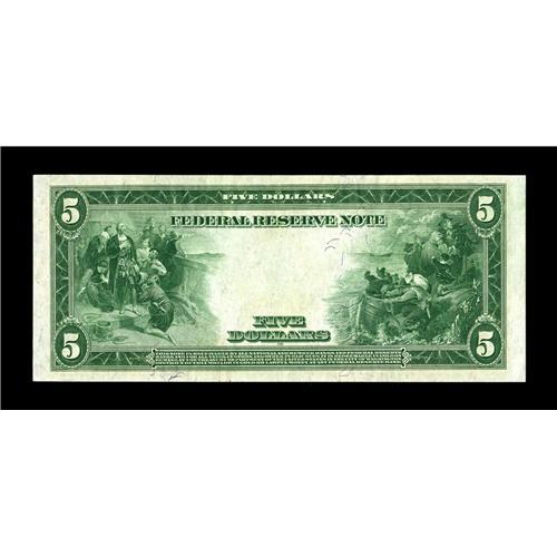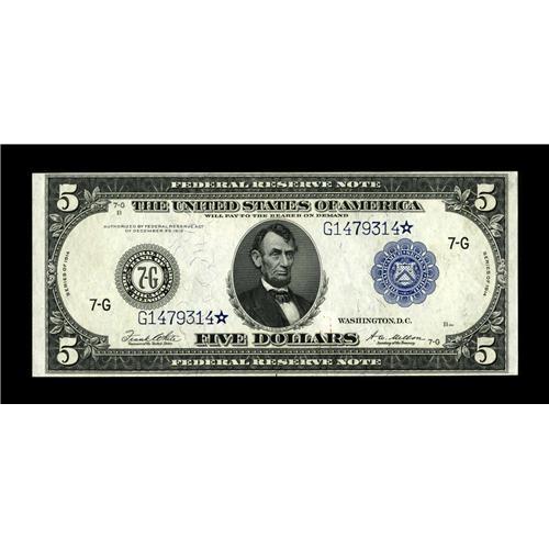 <B>Fr. 871c $5 1914 Federal Reserve Star Note Choice New.</B></I> Only four replacement notes are listed in the Murray census for this tough Friedberg number. The surfaces are crisp and bright with the only blemish a small paper clip rust stain on the front. This will mark the first time we have had the pleasure to auction this rarity since our consignor acquired this example December of 1988. No value above Extremely Fine is listed in Friedberg.<BR><I>Ex: Doug Murray</B></I><BR><BR><b>Shipping:</b> Coin/Currency (<a target="_blank" href="http://www.heritageauctions.com/common/shipping.php">view shipping information</a>)