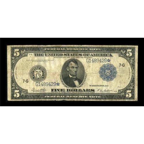 <B>Fr. 871c $5 1914 Federal Reserve Star Note Very Good.</B></I> Four star specimens are known for this Friedberg number, two quite high grade and two less than high grade. This example is one of the latter pieces. We recently sold one of the two uncirculated examples for over $6000. This unmolested note should easily be worth...<BR><I>From The Lawrence O'Neal Collection</B></I><BR><BR><b>Shipping:</b> Coins & Currency (<a target="_blank" href="http://www.heritageauctions.com/common/shipping.php">view shipping information</a>)