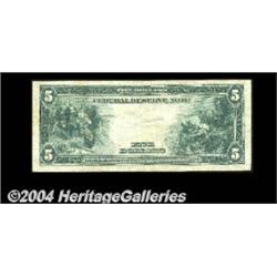 Fr. 872 $5 1914 Federal Reserve Note Fine-Very Fine. A perfectly natural note, with unmolested surfaces, good margins and strong color. It's only the fifth we've handled, with a census for all grades in the mid-teens. An underrated note, likely to attract quite a number of strong bids. <BR><BR><B>Important notice:</B> Heritage usually auctions material at the rate of 200-250 lots per hour. On some occasions eBay Live bid software or the Internet may not be able to keep up with the pace of the auction. We recommend placing a realistic absentee bid now as insurance to avoid disappointment. Occasionally the auctioneer may eliminate or reject an eBay Live bid, and the auctioneer may also reopen a lot after the close of the eBay live bidding (usually because we missed an audience bid), and may reject your bid even if it shows you as the winning bidder. By bidding via eBay Live, you agree that Heritage may award the lot to another bidder at its sole discretion under the circumstances described above or any other reasonable circumstances. Since eBay bids are not shown to us until we open the lot on the floor, we treat those bids just like floor bids. In most cases the floor responds before the eBay bid is presented to us, due to Internet lag time, so for consistency we have made it a policy that floor bids are always considered first over tie eBay live bids. Also please note that all Heritage lots purchased through eBay Live carry a 20% Buyer's Premium. Please make sure you read the Terms and Conditions before you bid. <BR><BR><B>IMPORTANT ANNOUNCEMENT ABOUT RESERVES:</B> Heritage now divulges all reserves on its web site 7 days before every auction. If you want to know whether the reserve on this lot has been met, and if not, what the reserve amount is, please visit this lot page on the HeritageCoin.com web site, or email: bid@HeritageGalleries.com