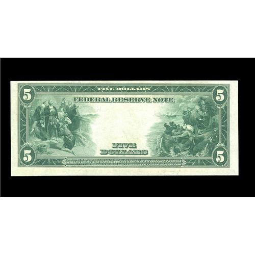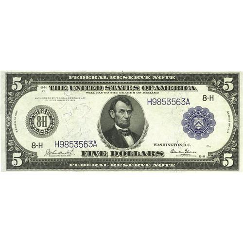 <B>Fr. 873 $5 1914 Federal Reserve Note Extremely Fine-About New</B></I> This condition-census rarity is clearly better than the average survivor for this scarce number. The majority of the two dozen or so survivors grades Fine. This piece shows a couple of faint folds, sharp corners, and solid margins.