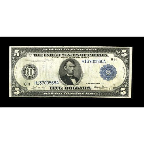 <B>Fr. 873 $5 1914 Federal Reserve Note Very Fine.</B></I> Here is a bright, lightly circulated example of this tougher signature combination.<BR><BR><b>Shipping:</b> Coin/Currency (<a target="_blank" href="http://www.heritageauctions.com/common/shipping.php">view shipping information</a>)