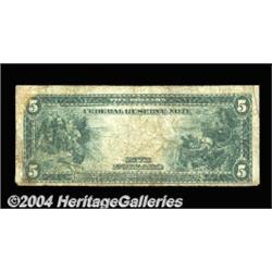Fr. 873 $5 1914 Federal Reserve Note Very Good-Fine. This is the eighth example of this number we've sold, which is rather surprising, as the entire census is just a few more than that. The note is well worn, with a little bit of soil, but no real problems. A natural piece, with good eye appeal for the grade. <BR><BR><B>Important notice:</B> Heritage usually auctions material at the rate of 200-250 lots per hour. On some occasions eBay Live bid software or the Internet may not be able to keep up with the pace of the auction. We recommend placing a realistic absentee bid now as insurance to avoid disappointment. Occasionally the auctioneer may eliminate or reject an eBay Live bid, and the auctioneer may also reopen a lot after the close of the eBay live bidding (usually because we missed an audience bid), and may reject your bid even if it shows you as the winning bidder. By bidding via eBay Live, you agree that Heritage may award the lot to another bidder at its sole discretion under the circumstances described above or any other reasonable circumstances. Since eBay bids are not shown to us until we open the lot on the floor, we treat those bids just like floor bids. In most cases the floor responds before the eBay bid is presented to us, due to Internet lag time, so for consistency we have made it a policy that floor bids are always considered first over tie eBay live bids. Also please note that all Heritage lots purchased through eBay Live carry a 20% Buyer's Premium. Please make sure you read the Terms and Conditions before you bid. <BR><BR><B>IMPORTANT ANNOUNCEMENT ABOUT RESERVES:</B> Heritage now divulges all reserves on its web site 7 days before every auction. If you want to know whether the reserve on this lot has been met, and if not, what the reserve amount is, please visit this lot page on the HeritageCoin.com web site, or email: bid@HeritageGalleries.com