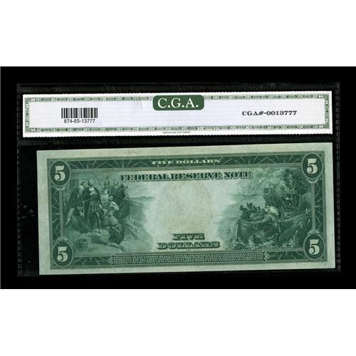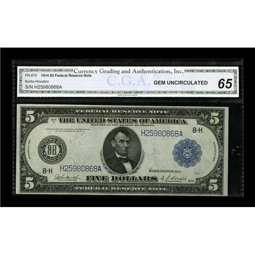 <B>Fr. 874 $5 1914 Federal Reserve Note CGA Gem Uncirculated 65.</B></I> In terms of FRN's, this is a little better Friedberg number. Only about 50 examples are known to be extant, and this piece ranks among the finest of those available. The note is evenly centered inside four sufficient margins. The printed details are deep and the note is colorful.<BR><BR><b>Shipping:</b> Coin/Currency (<a target="_blank" href="http://www.heritageauctions.com/common/shipping.php">view shipping information</a>)