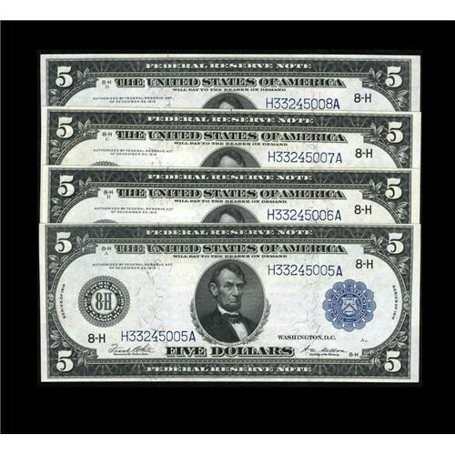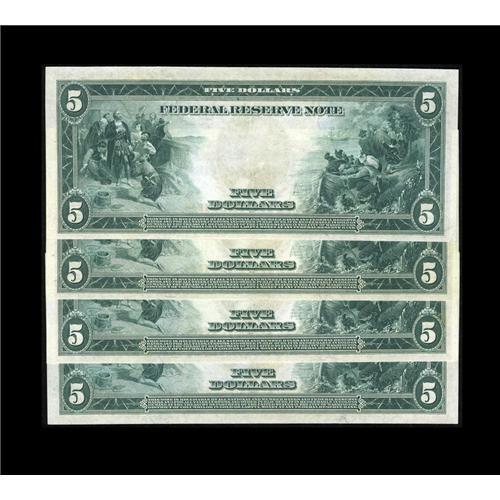 <B>Fr. 875a $5 1914 Federal Reserve Notes Cut Sheet of Four Extremely Fine-About New.</B></I> Three soft vertical folds are seen on each of these brightly colored notes. This becomes the second such sheet known from this tougher district.