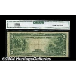 Fr. 875b $5 1914 Federal Reserve Note CGA Fine 12. About 20 examples are known of this number in all grades combined. <BR><BR><B>Important notice:</B> Heritage usually auctions material at the rate of 200-250 lots per hour. On some occasions eBay Live bid software or the Internet may not be able to keep up with the pace of the auction. We recommend placing a realistic absentee bid now as insurance to avoid disappointment. Occasionally the auctioneer may eliminate or reject an eBay Live bid, and the auctioneer may also reopen a lot after the close of the eBay live bidding (usually because we missed an audience bid), and may reject your bid even if it shows you as the winning bidder. By bidding via eBay Live, you agree that Heritage may award the lot to another bidder at its sole discretion under the circumstances described above or any other reasonable circumstances. Since eBay bids are not shown to us until we open the lot on the floor, we treat those bids just like floor bids. In most cases the floor responds before the eBay bid is presented to us, due to Internet lag time, so for consistency we have made it a policy that floor bids are always considered first over tie eBay live bids. Also please note that all Heritage lots purchased through eBay Live carry a 20% Buyer's Premium. Please make sure you read the Terms and Conditions before you bid. <BR><BR><B>IMPORTANT ANNOUNCEMENT ABOUT RESERVES:</B> Heritage now divulges all reserves on its web site 7 days before every auction. If you want to know whether the reserve on this lot has been met, and if not, what the reserve amount is, please visit this lot page on the HeritageCoin.com web site, or email: bid@HeritageGalleries.com