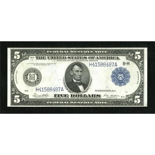<B>Fr. 875b $5 1914 Federal Reserve Note Extremely Fine-About New.</B></I> The "b" variety on St. Louis is much scarcer than the "a" variety, while there were no "c" variety Fives printed for St. Louis. The St. Louis "b" variety has a recorded population of around 30 serial numbers in the census. Plenty of crispness remains.<BR><BR><b>Shipping:</b> Coins & Currency (<a target="_blank" href="http://www.heritageauctions.com/common/shipping.php">view shipping information</a>)