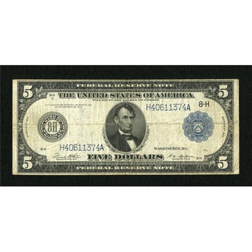 <B>Fr. 875b $5 1914 Federal Reserve Note Fine.</B></I> Around two dozen serial numbers are in the census for this Friedberg number.<BR><BR><b>Shipping:</b> Coins & Currency (<a target="_blank" href="http://www.heritageauctions.com/common/shipping.php">view shipping information</a>)