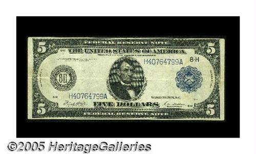 <B>Fr. 875b $5 1914 Federal Reserve Note Very Fine.</B></I> This scarce St. Louis $5 was once folded into eighths.
