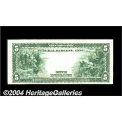 Fr. 875b $5 1914 Federal Reserve Note Very Choice New. With just a slightly broader top margin, this rare number would be a perfect Gem. About 20 pieces are known for all grades combined, and few if any are this nice. <BR><BR><B>Important notice:</B> Heritage usually auctions material at the rate of 200-250 lots per hour. On some occasions eBay Live bid software or the Internet may not be able to keep up with the pace of the auction. We recommend placing a realistic absentee bid now as insurance to avoid disappointment. Occasionally the auctioneer may eliminate or reject an eBay Live bid, and the auctioneer may also reopen a lot after the close of the eBay live bidding (usually because we missed an audience bid), and may reject your bid even if it shows you as the winning bidder. By bidding via eBay Live, you agree that Heritage may award the lot to another bidder at its sole discretion under the circumstances described above or any other reasonable circumstances. Since eBay bids are not shown to us until we open the lot on the floor, we treat those bids just like floor bids. In most cases the floor responds before the eBay bid is presented to us, due to Internet lag time, so for consistency we have made it a policy that floor bids are always considered first over tie eBay live bids. Also please note that all Heritage lots purchased through eBay Live carry a 20% Buyer's Premium. Please make sure you read the Terms and Conditions before you bid. <BR><BR><B>IMPORTANT ANNOUNCEMENT ABOUT RESERVES:</B> Heritage now divulges all reserves on its web site 7 days before every auction. If you want to know whether the reserve on this lot has been met, and if not, what the reserve amount is, please visit this lot page on the HeritageCoin.com web site, or email: bid@HeritageGalleries.com