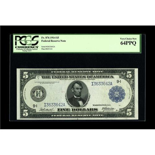<B>Fr. 876 $5 1914 Federal Reserve Note PCGS Very Choice New 64PPQ.</B></I> About 60 notes are known, but very few are Uncs and the highest third party grade Fr. 876 to reach the auction block so far has been an EF. This Minneapolis Five comes just to the cusp of the full Gem grade. It's well margined, strictly original, and beautifully bright.<BR><I>From The Bill and Kathy Stella Currency Collection</B></I><BR><BR><b>Shipping:</b> Coin/Currency (<a target="_blank" href="http://www.heritageauctions.com/common/shipping.php">view shipping information</a>)