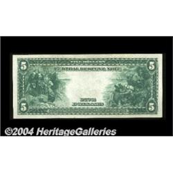 Fr. 877 $5 1914 Federal Reserve Note Choice New. Only about 20 examples of this number are known. This one was last on the market in Stack's March of 1991 sale. <BR><BR><B>Important notice:</B> Heritage usually auctions material at the rate of 200-250 lots per hour. On some occasions eBay Live bid software or the Internet may not be able to keep up with the pace of the auction. We recommend placing a realistic absentee bid now as insurance to avoid disappointment. Occasionally the auctioneer may eliminate or reject an eBay Live bid, and the auctioneer may also reopen a lot after the close of the eBay live bidding (usually because we missed an audience bid), and may reject your bid even if it shows you as the winning bidder. By bidding via eBay Live, you agree that Heritage may award the lot to another bidder at its sole discretion under the circumstances described above or any other reasonable circumstances. Since eBay bids are not shown to us until we open the lot on the floor, we treat those bids just like floor bids. In most cases the floor responds before the eBay bid is presented to us, due to Internet lag time, so for consistency we have made it a policy that floor bids are always considered first over tie eBay live bids. Also please note that all Heritage lots purchased through eBay Live carry a 20% Buyer's Premium. Please make sure you read the Terms and Conditions before you bid. <BR><BR><B>IMPORTANT ANNOUNCEMENT ABOUT RESERVES:</B> Heritage now divulges all reserves on its web site 7 days before every auction. If you want to know whether the reserve on this lot has been met, and if not, what the reserve amount is, please visit this lot page on the HeritageCoin.com web site, or email: bid@HeritageGalleries.com
