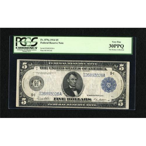 <B>Fr. 879a $5 1914 Federal Reserve Note PCGS Very Fine 30PPQ.</B></I> Minneapolis is a bit tougher issue to locate. Nicely margined and brightly inked.<BR><BR><b>Shipping:</b> Coins & Currency (<a target="_blank" href="http://www.heritageauctions.com/common/shipping.php">view shipping information</a>)