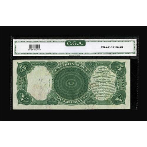 <B>Fr. 88 $5 1907 Legal Tender CGA Gem Uncirculated 66.</B></I> Clearly original with better top and bottom margins than we usually see on 1907 Pioneer Family fives. The ink and paper colors are excellent.<BR><BR><b>Shipping:</b> Coins & Currency (<a target="_blank" href="http://www.heritageauctions.com/common/shipping.php">view shipping information</a>)