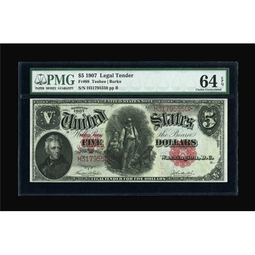 <B>Fr. 88 $5 1907 Legal Tender PMG Choice Uncirculated 64 EPQ.</B></I> A touch larger top margin and this original and boldly embossed example would have surely earned a full Gem grade.<BR><BR><b>Shipping:</b> Coins & Currency (<a target="_blank" href="http://www.heritageauctions.com/common/shipping.php">view shipping information</a>)