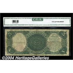 Fr. 88 $5 1907 Legal Tender Star Note CGA Fine 12. Murray lists 22 examples of this face plate II star. This one appears solid for the grade and has retained excellent color considering its degree of circulation. <BR><BR><B>Important notice:</B> Heritage usually auctions material at the rate of 200-250 lots per hour. On some occasions eBay Live bid software or the Internet may not be able to keep up with the pace of the auction. We recommend placing a realistic absentee bid now as insurance to avoid disappointment. Occasionally the auctioneer may eliminate or reject an eBay Live bid, and the auctioneer may also reopen a lot after the close of the eBay live bidding (usually because we missed an audience bid), and may reject your bid even if it shows you as the winning bidder. By bidding via eBay Live, you agree that Heritage may award the lot to another bidder at its sole discretion under the circumstances described above or any other reasonable circumstances. Since eBay bids are not shown to us until we open the lot on the floor, we treat those bids just like floor bids. In most cases the floor responds before the eBay bid is presented to us, due to Internet lag time, so for consistency we have made it a policy that floor bids are always considered first over tie eBay live bids. Also please note that all Heritage lots purchased through eBay Live carry a 20% Buyer's Premium. Please make sure you read the Terms and Conditions before you bid. <BR><BR><B>IMPORTANT ANNOUNCEMENT ABOUT RESERVES:</B> Heritage now divulges all reserves on its web site 7 days before every auction. If you want to know whether the reserve on this lot has been met, and if not, what the reserve amount is, please visit this lot page on the HeritageCoin.com web site, or email: bid@HeritageGalleries.com