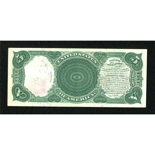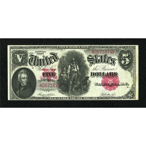 <B>Fr. 88 $5 1907 Legal Tender Very Fine.</B></I> The inks are dark on this attractive note. This Woodchopper has the second face plate position for this Friedberg number. The first position is directly below the plate letter in the lower right-hand corner. In the second position, the plate number is level with the bottom of the lower right-hand plate letter. The dividing point between the two varieties are face plates 832 and 833.<BR><I>From The John Ameen Collection</B></I><BR><BR><b>Shipping:</b> Coins & Currency (<a target="_blank" href="http://www.heritageauctions.com/common/shipping.php">view shipping information</a>)