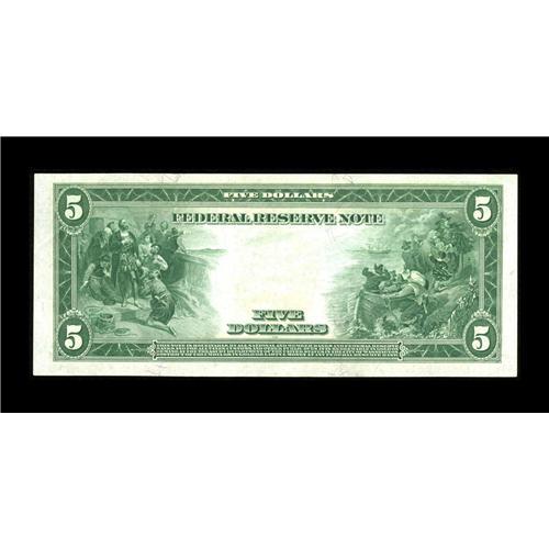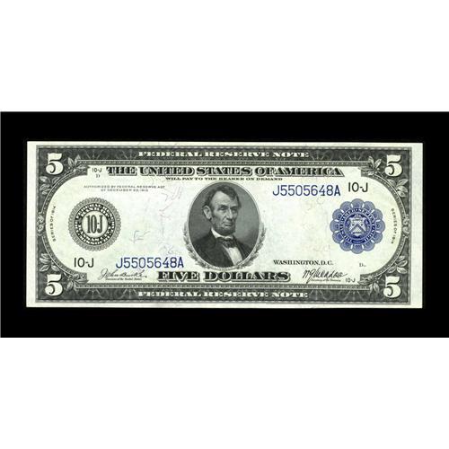 <B>Fr. 880 $5 1914 Federal Reserve Note Choice New.</B></I> The fine Charles Burt engraving of Lincoln is the central aspect of the face design of this note, and there are a couple of wonderful historical engravings on the reverse. This example has very vivid colors and above average centering. A hint of teller handling at upper right hinders a higher grade.<BR><I>From The Bill and Kathy Stella Currency Collection</B></I><BR><BR><b>Shipping:</b> Coin/Currency (<a target="_blank" href="http://www.heritageauctions.com/common/shipping.php">view shipping information</a>)