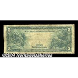 Fr. 881 $5 1914 Federal Reserve Note Fine. A very rare Burke-Glass Kansas City, with less than a dozen examples known for all grades combined. Only a single example is high-grade, and that has been off the market since the mid-eighties. An important rarity that is problem free save for the normal soil one would associate with the grade. A perfectly natural note. <BR><BR><B>Important notice:</B> Heritage usually auctions material at the rate of 200-250 lots per hour. On some occasions eBay Live bid software or the Internet may not be able to keep up with the pace of the auction. We recommend placing a realistic absentee bid now as insurance to avoid disappointment. Occasionally the auctioneer may eliminate or reject an eBay Live bid, and the auctioneer may also reopen a lot after the close of the eBay live bidding (usually because we missed an audience bid), and may reject your bid even if it shows you as the winning bidder. By bidding via eBay Live, you agree that Heritage may award the lot to another bidder at its sole discretion under the circumstances described above or any other reasonable circumstances. Since eBay bids are not shown to us until we open the lot on the floor, we treat those bids just like floor bids. In most cases the floor responds before the eBay bid is presented to us, due to Internet lag time, so for consistency we have made it a policy that floor bids are always considered first over tie eBay live bids. Also please note that all Heritage lots purchased through eBay Live carry a 20% Buyer's Premium. Please make sure you read the Terms and Conditions before you bid. <BR><BR><B>IMPORTANT ANNOUNCEMENT ABOUT RESERVES:</B> Heritage now divulges all reserves on its web site 7 days before every auction. If you want to know whether the reserve on this lot has been met, and if not, what the reserve amount is, please visit this lot page on the HeritageCoin.com web site, or email: bid@HeritageGalleries.com