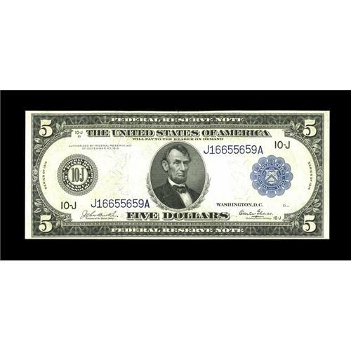<B>Fr. 881 $5 1914 Federal Reserve Note Very Choice New.</B></I> Embossing, nice centering, and natural paper wave are highlights of this scarce KC $5. We sold the preceding serial number note that is a carbon copy of this note in May 2002 for over $500. In fact this and the other note discussed are the highest graded examples we have ever sold of this Friedberg number. This Kansas City Burke-Glass $5 is represented in the census with less than 20 recorded serial numbers.<BR><BR><b>Shipping:</b> Coins & Currency (<a target="_blank" href="http://www.heritageauctions.com/common/shipping.php">view shipping information</a>)