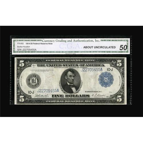 <B>Fr. 882 $5 1914 Federal Reserve Note CGA About Uncirculated 50.</B></I> Kansas City is a district that remains quite collectible. This KC $5 is nicely margined and bright.<BR><BR><b>Shipping:</b> Coins & Currency (<a target="_blank" href="http://www.heritageauctions.com/common/shipping.php">view shipping information</a>)