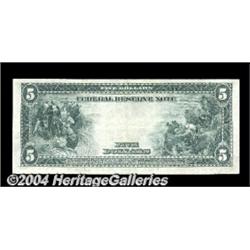 Fr. 882 $5 1914 Federal Reserve Note Very Fine-Extremely Fine. Mid-range for rarity, with about 25 examples known. This one is a beauty, with the color of an uncirculated note, and almost no sign of circulation other than folds. <BR><BR><B>Important notice:</B> Heritage usually auctions material at the rate of 200-250 lots per hour. On some occasions eBay Live bid software or the Internet may not be able to keep up with the pace of the auction. We recommend placing a realistic absentee bid now as insurance to avoid disappointment. Occasionally the auctioneer may eliminate or reject an eBay Live bid, and the auctioneer may also reopen a lot after the close of the eBay live bidding (usually because we missed an audience bid), and may reject your bid even if it shows you as the winning bidder. By bidding via eBay Live, you agree that Heritage may award the lot to another bidder at its sole discretion under the circumstances described above or any other reasonable circumstances. Since eBay bids are not shown to us until we open the lot on the floor, we treat those bids just like floor bids. In most cases the floor responds before the eBay bid is presented to us, due to Internet lag time, so for consistency we have made it a policy that floor bids are always considered first over tie eBay live bids. Also please note that all Heritage lots purchased through eBay Live carry a 20% Buyer's Premium. Please make sure you read the Terms and Conditions before you bid. <BR><BR><B>IMPORTANT ANNOUNCEMENT ABOUT RESERVES:</B> Heritage now divulges all reserves on its web site 7 days before every auction. If you want to know whether the reserve on this lot has been met, and if not, what the reserve amount is, please visit this lot page on the HeritageCoin.com web site, or email: bid@HeritageGalleries.com