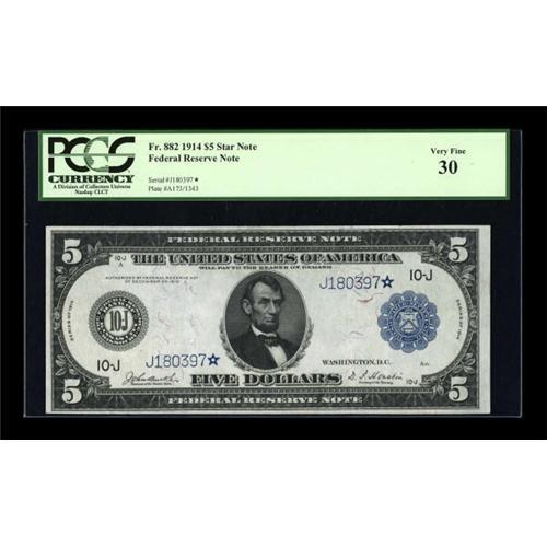 <B>Fr. 882 $5 1914 Federal Reserve Star Note PCGS Very Fine 30.</B></I> This example is arguably the finest known Fr. 882 star, as it appears that PCGS was more than a mite conservative in assigning a grade of Very Fine 30. It's listed in the census as Extremely Fine, and, through the holder, it certainly lays substantial claim to that ranking. Only one other of the nine known grades Fine or better, and, whether finest or second finest, it is an attractive and scarce item worthy of a strong bid. <BR><I>From The Lawrence O'Neal Collection</B></I><BR><BR><b>Shipping:</b> Coins & Currency (<a target="_blank" href="http://www.heritageauctions.com/common/shipping.php">view shipping information</a>)