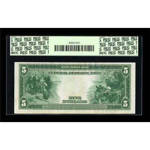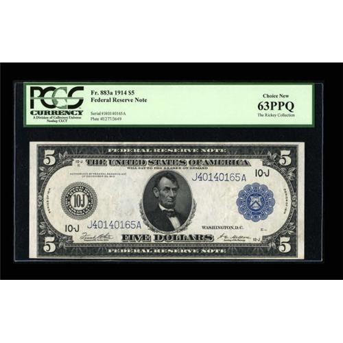 <B>Fr. 883a $5 1914 Federal Reserve Note PCGS Choice New 63PPQ.</B></I> A crisp, well embossed example from the Kansas City district. Dark inks have survived the test of time. <BR><BR><b>Shipping:</b> Coins & Currency (<a target="_blank" href="http://www.heritageauctions.com/common/shipping.php">view shipping information</a>)