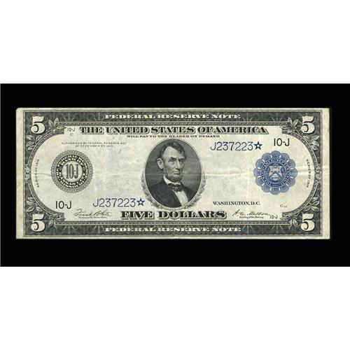 <B>Fr. 883a $5 1914 Federal Reserve Star Note Very Fine.</B></I> This clean example has bright surfaces with the usual amount of handling encountered for the grade.<BR><I>From the Large Size Star Note Collection of Richard Merlau</B></I>