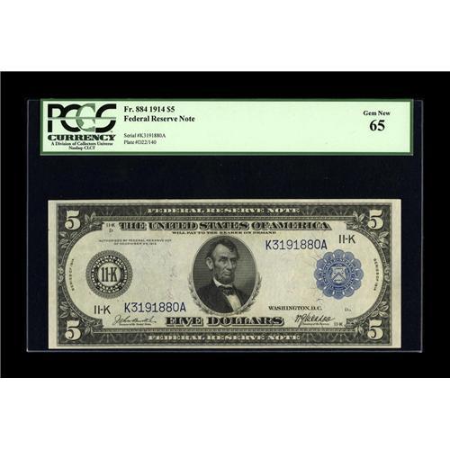 <B>Fr. 884 $5 1914 Federal Reserve Note PCGS Gem New 65.</B></I> Only nine of the twenty one surviving examples have been offered for sale at public auction. This piece, one of only two Uncirculated issues in the census has been off the market for over a decade. The paper is a touch dull, though its other attributes are all full Gem or better.<BR><I>From The Bill and Kathy Stella Currency Collection</B></I><BR><BR><b>Shipping:</b> Coin/Currency (<a target="_blank" href="http://www.heritageauctions.com/common/shipping.php">view shipping information</a>)