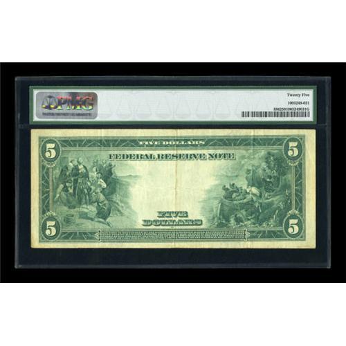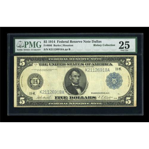 <B>Fr. 886 $5 1914 Federal Reserve Note PMG Very Fine 25.</B></I> This Burke-Houston issue is from one of the most collected districts. The paper is solid and problem free.<BR><BR><b>Shipping:</b> Coins & Currency (<a target="_blank" href="http://www.heritageauctions.com/common/shipping.php">view shipping information</a>)