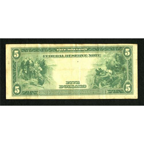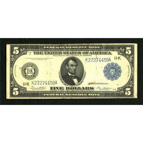 <B>Fr. 887a $5 1914 Federal Reserve Note Fine.</B></I> This $5 has toned a shade over the years.<BR><BR><b>Shipping:</b> Coins & Currency (<a target="_blank" href="http://www.heritageauctions.com/common/shipping.php">view shipping information</a>)