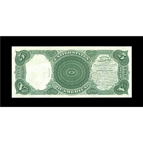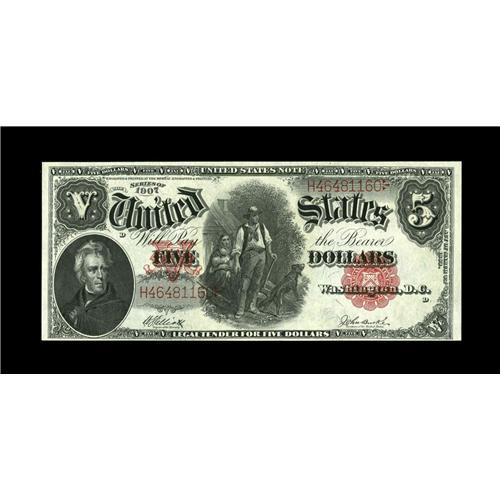 <B>Fr. 89 $5 1907 Legal Tender Choice About New.</B></I> This tougher Friedberg example is one fold away from choice. The color is just dazzling and the embossing is jutting out of the paper.