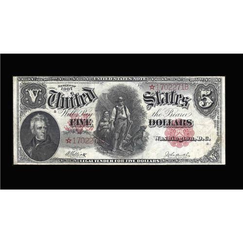 <B>Fr. 89 $5 1907 Legal Tender Star Very Fine.</B></I> Though Doug Murray's book lists only four known examples, the Gengerke census shows five more examples for a total of nine. This attractive mid-grade issue is solid for the grade and quite colorful.<BR><I>From the Large Size Star Note Collection of Richard Merlau</B></I>