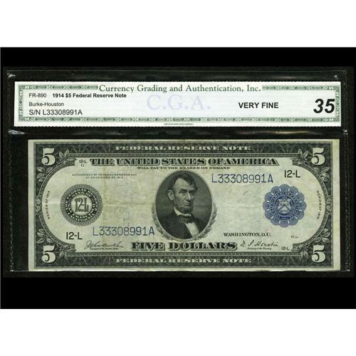 <B>Fr. 890 $5 1914 Federal Reserve Note CGA Very Fine 35.</B></I> A really scarce San Francisco note, with only about 20 pieces known in all grades combined. CAA has sold nine examples. While new numbers are always being located, it's a pretty safe bet that a piece with a census this low at this point will always be a scarce note.