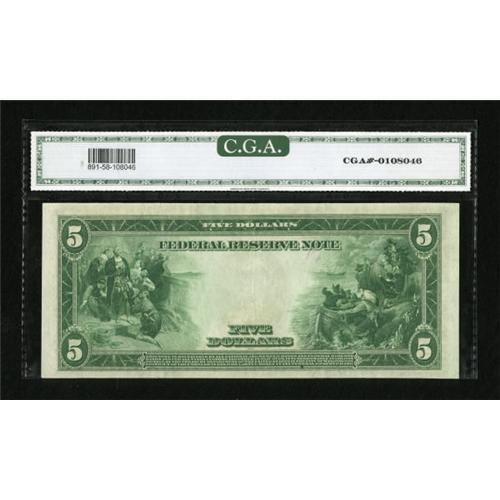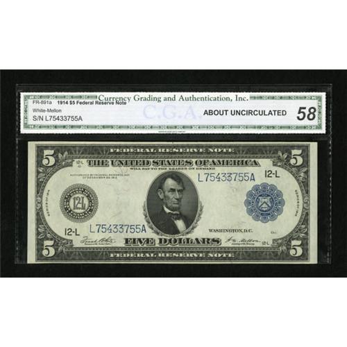 <B>Fr. 891a $5 1914 Federal Reserve Note CGA About Uncirculated 58.</B></I> This piece faces up like a fully uncirculated note. The fold at center is more visible when viewed from the back.<BR><BR><b>Shipping:</b> Coins & Currency (<a target="_blank" href="http://www.heritageauctions.com/common/shipping.php">view shipping information</a>)