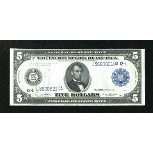 <B>Fr. 891a $5 1914 Federal Reserve Note Extremely Fine-About New.</B></I> This San Francisco note had been wet long ago, but remains bright with plenty of eye appeal.<BR><BR><b>Shipping:</b> Coins & Currency (<a target="_blank" href="http://www.heritageauctions.com/common/shipping.php">view shipping information</a>)