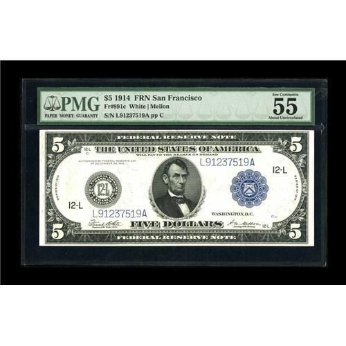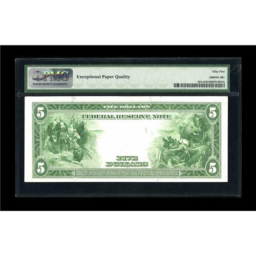 <B>Fr. 891c $5 1914 Federal Reserve Note PMG About Uncirculated 55 EPQ.</B></I> This is a rare Friedberg number with only around ten serial numbers in the census and one of those notes is in the Smithsonian Institution. The current example is a new addition to the census with it possibly being the nicest known.<BR><BR><b>Shipping:</b> Coins & Currency (<a target="_blank" href="http://www.heritageauctions.com/common/shipping.php">view shipping information</a>)