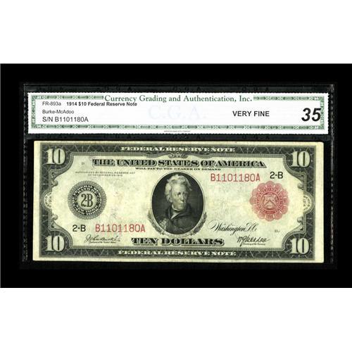 <B>Fr. 893a $10 1914 Red Seal Federal Reserve Note CGA Very Fine 35.</B></I> This is by far the scarcer of the two $10 New York Red Seal varieties.<BR><BR><b>Shipping:</b> Coin/Currency (<a target="_blank" href="http://www.heritageauctions.com/common/shipping.php">view shipping information</a>)