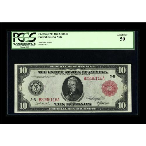 <B>Fr. 893a $10 1914 Red Seal Federal Reserve Note PCGS About New 50.</B></I> This is a pleasing, lightly circulated example that remains bright, and is the scarcer of the two New York Red Seal varieties.<BR><BR><b>Shipping:</b> Coins & Currency (<a target="_blank" href="http://www.heritageauctions.com/common/shipping.php">view shipping information</a>)