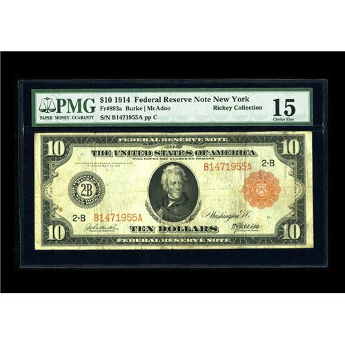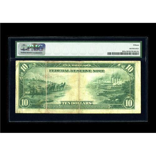 <B>Fr. 893a $10 1914 Red Seal Federal Reserve Note PMG Choice Fine 15.</B></I> This interesting Red Seal is recorded in the census though there are no sale records associated with its entry. The note could technically be VF, though the folds that account for the grade are a little heavier than usually seen. <BR><I>Ex: Rickey Collection</B></I><BR><BR><b>Shipping:</b> Coin/Currency (<a target="_blank" href="http://www.heritageauctions.com/common/shipping.php">view shipping information</a>)
