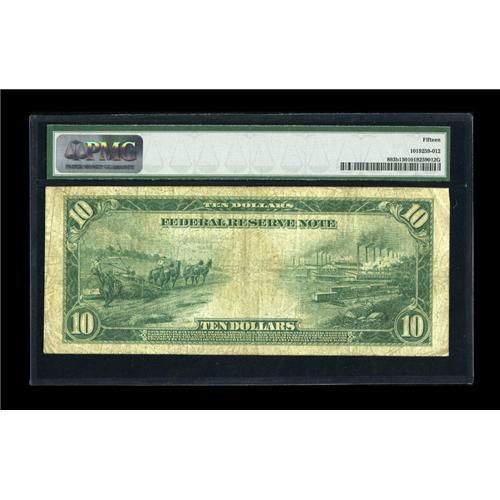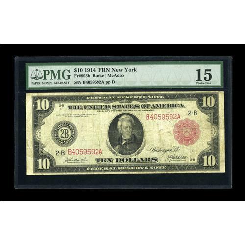 <B>Fr. 893b $10 1914 Red Seal Federal Reserve Note PMG Choice Fine 15.</B></I> Despite the moderate amounts of circulation, the seal and serial numbers remain bold.<BR><BR><b>Shipping:</b> Coins & Currency (<a target="_blank" href="http://www.heritageauctions.com/common/shipping.php">view shipping information</a>)