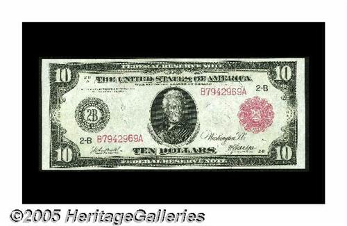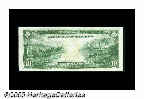 <B>Fr. 893b $10 1914 Red Seal Federal Reserve Note Gem New.</B></I> A gorgeous Red Seal Ten, with huge margins, bright, fresh colors and near-perfect centering of both sides. Red Seal Tens in this high a grade are truly difficult to come by, and this one could easily elicit a runaway price.