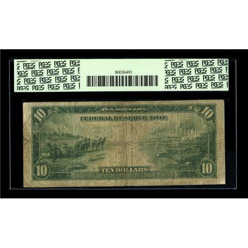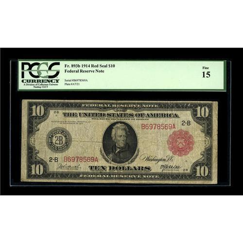 <B>Fr. 893b $10 1914 Red Seal Federal Reserve Note PCGS Fine 15.</B></I> This is a pleasingly original note with a bold red overprint. We must mention for accuracy's sake that there is a bit of light showing through the intersection of the vertical fold and center fold.<BR><BR><b>Shipping:</b> Coins & Currency (<a target="_blank" href="http://www.heritageauctions.com/common/shipping.php">view shipping information</a>)