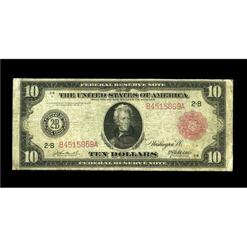<B>Fr. 893b $10 1914 Red Seal Federal Reserve Note Very Good-Fine.</B></I> A totally solid example with natural paper surfaces and no problems of any kind. The red overprint is particularly bold considering the degree of circulation. This is the most common of the Ten Dollar Red Seals making it an ideal representation of the type.