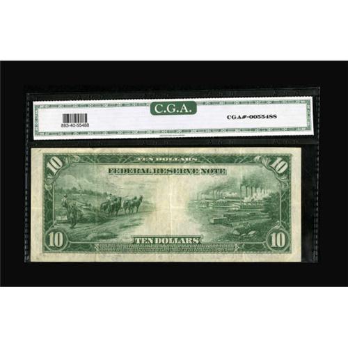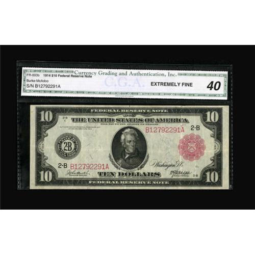 <B>Fr. 893b $10 1914 Red Seal Federal Reserve Note CGA Extremely Fine 40.</B></I> The overprint is still sufficiently bright for the grade.<BR><BR><b>Shipping:</b> Coins & Currency (<a target="_blank" href="http://www.heritageauctions.com/common/shipping.php">view shipping information</a>)