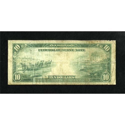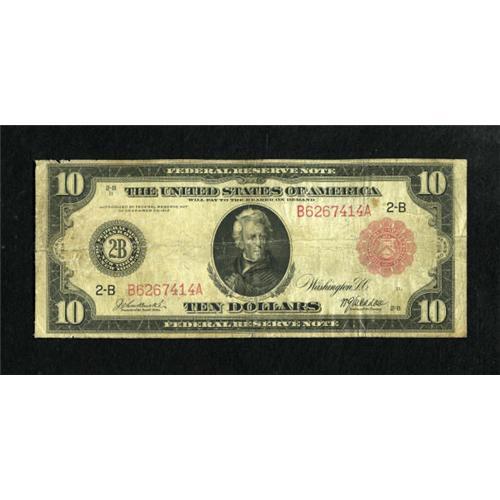 <B>Fr. 893b $10 1914 Red Seal Federal Reserve Note Very Good.</B></I> Red Seal "b" notes have the same layout as Blue Seal "a" notes. This $10 Red Seal was once wet. A left edge tear is approximately one inch long.<BR><BR><b>Shipping:</b> Coins & Currency (<a target="_blank" href="http://www.heritageauctions.com/common/shipping.php">view shipping information</a>)