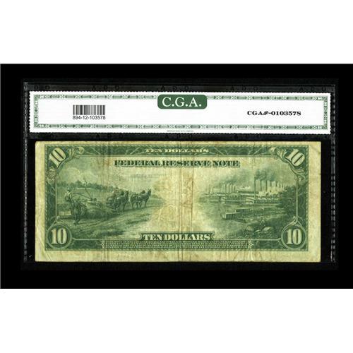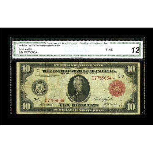 <B>Fr. 894b $10 1914 Red Seal Federal Reserve Note CGA Fine 12.</B></I> A well circulated $10 Red Seal from Philadelphia free from any distractions inconsistent with its certified grade.<BR><BR><b>Shipping:</b> Coin/Currency (<a target="_blank" href="http://www.heritageauctions.com/common/shipping.php">view shipping information</a>)