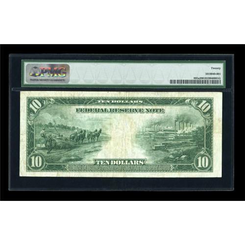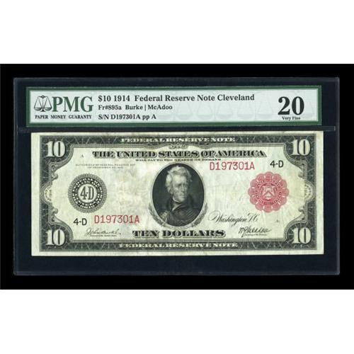 <B>Fr. 895a $10 1914 Red Seal Federal Reserve Note PMG Very Fine 20.</B></I> A bold red overprint complements the eye appeal on this Cleveland issue. Only ten examples of this scarce Friedberg number are known, with the last live auction appearance in 2005.<BR><BR><b>Shipping:</b> Coins & Currency (<a target="_blank" href="http://www.heritageauctions.com/common/shipping.php">view shipping information</a>)