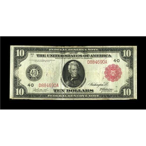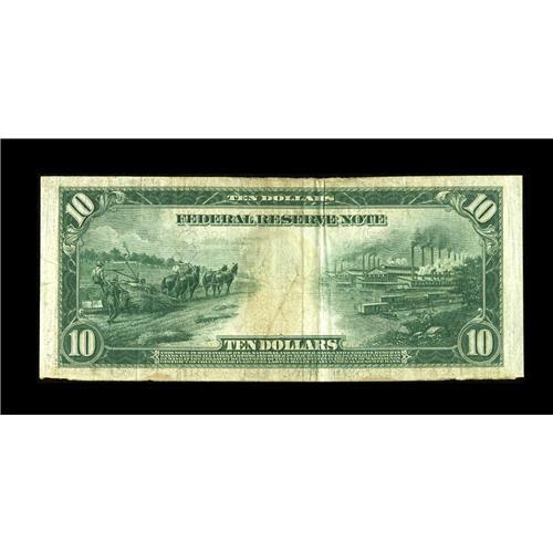 <B>Fr. 895b $10 1914 Red Seal Federal Reserve Note Fine-Very Fine.</B></I> Only about 20 examples are known for this Cleveland Red Seal Friedberg number. In all of our auctions since 1990, we have had very few of these in a higher grade.<BR><I>From The Bill and Kathy Stella Currency Collection</B></I><BR><BR><b>Shipping:</b> Coin/Currency (<a target="_blank" href="http://www.heritageauctions.com/common/shipping.php">view shipping information</a>)